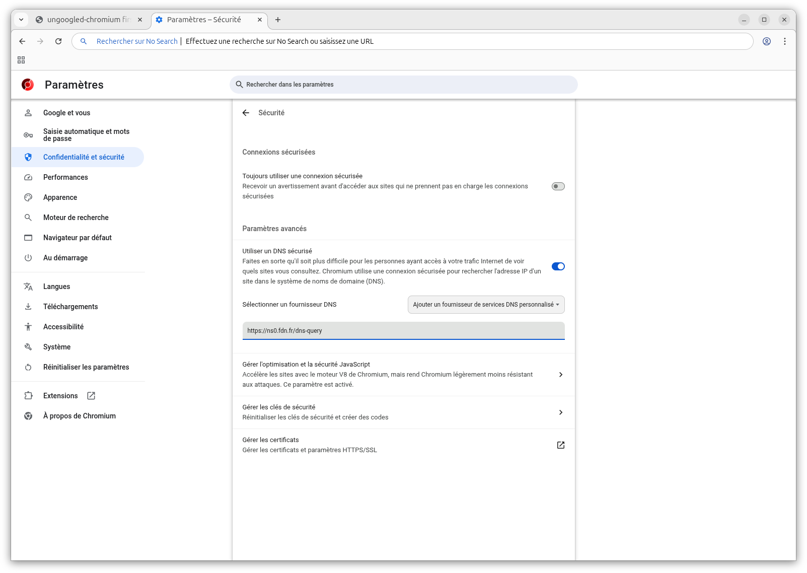 Si vous souhaitez pointer depuis votre navigateur vers un serveur DNS tiers, capable de vous protéger de certains spams et malwares ou publicités, voici comment le configurer sous UG :