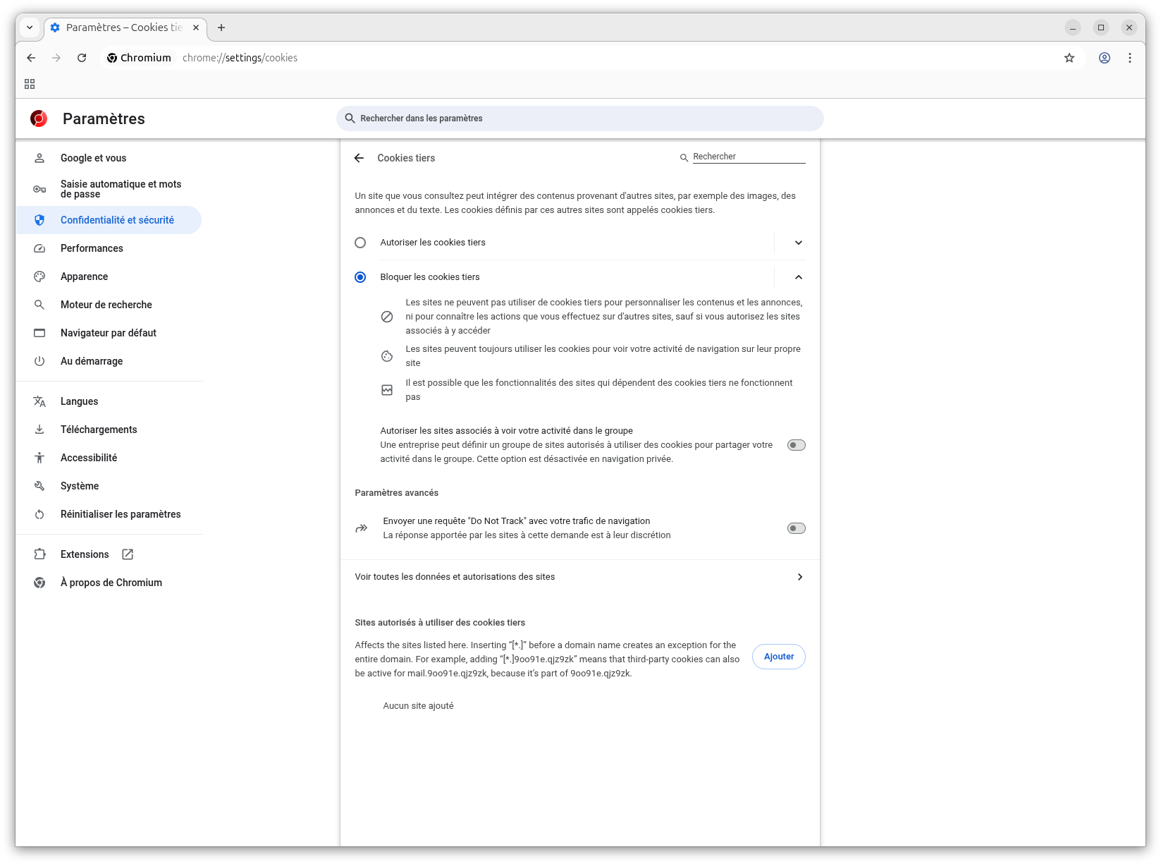Par défaut, Ungoogled Chromium bloque tous les "cookies tiers". Nous recommandons généralement de supprimer tous les cookies lorsque vous fermez le navigateur. Voici un aperçu :