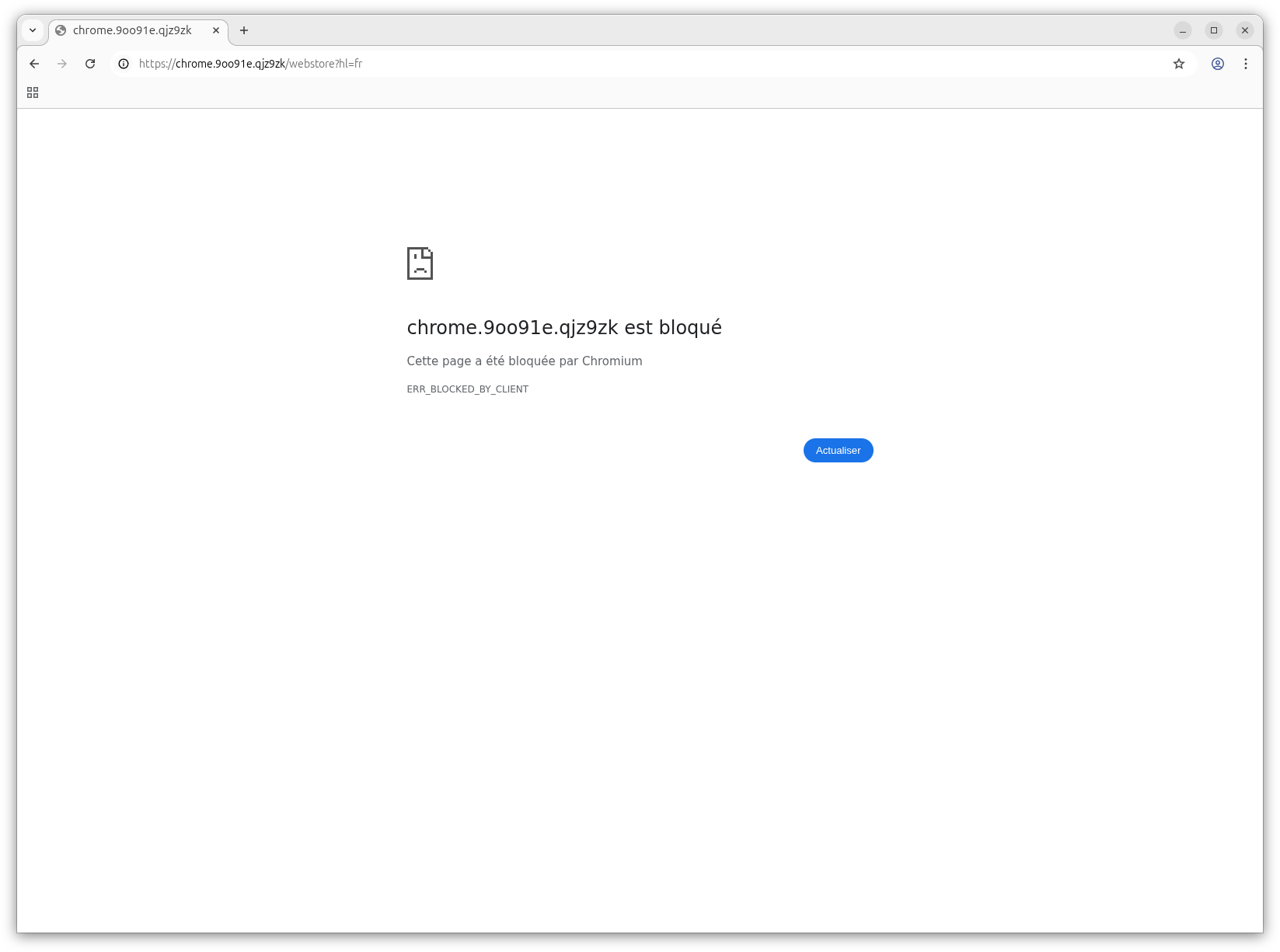Ungoogled Chromium n'autorise pas par défaut l'installation d'extensions. En effet, UG coupe toute discussion avec les serveurs Google, et les extensions sont toutes stockées sur les serveurs Google. Lorsque vous tenterez de visiter le Chrome Web Store, vous tomberez sur cette page :