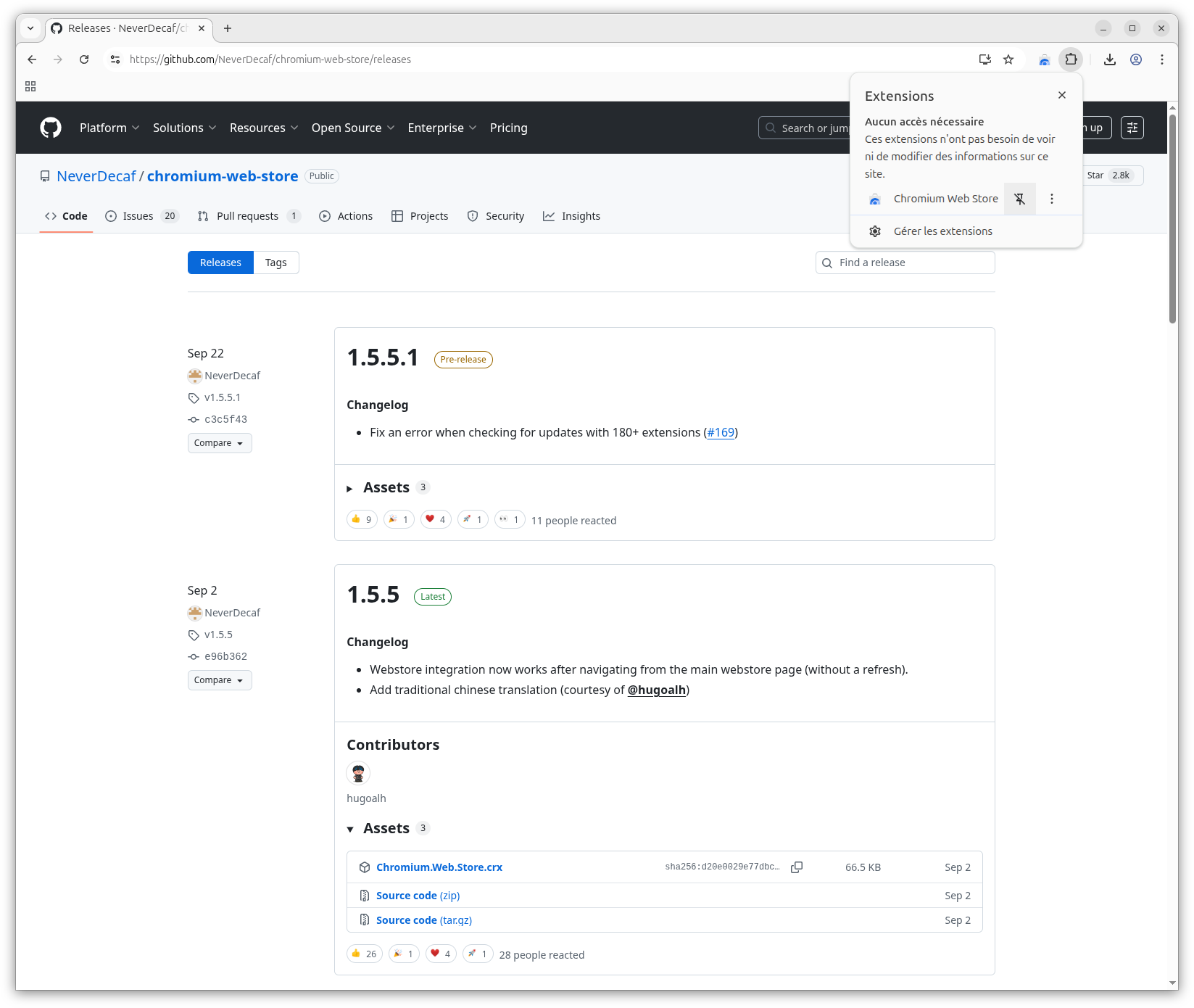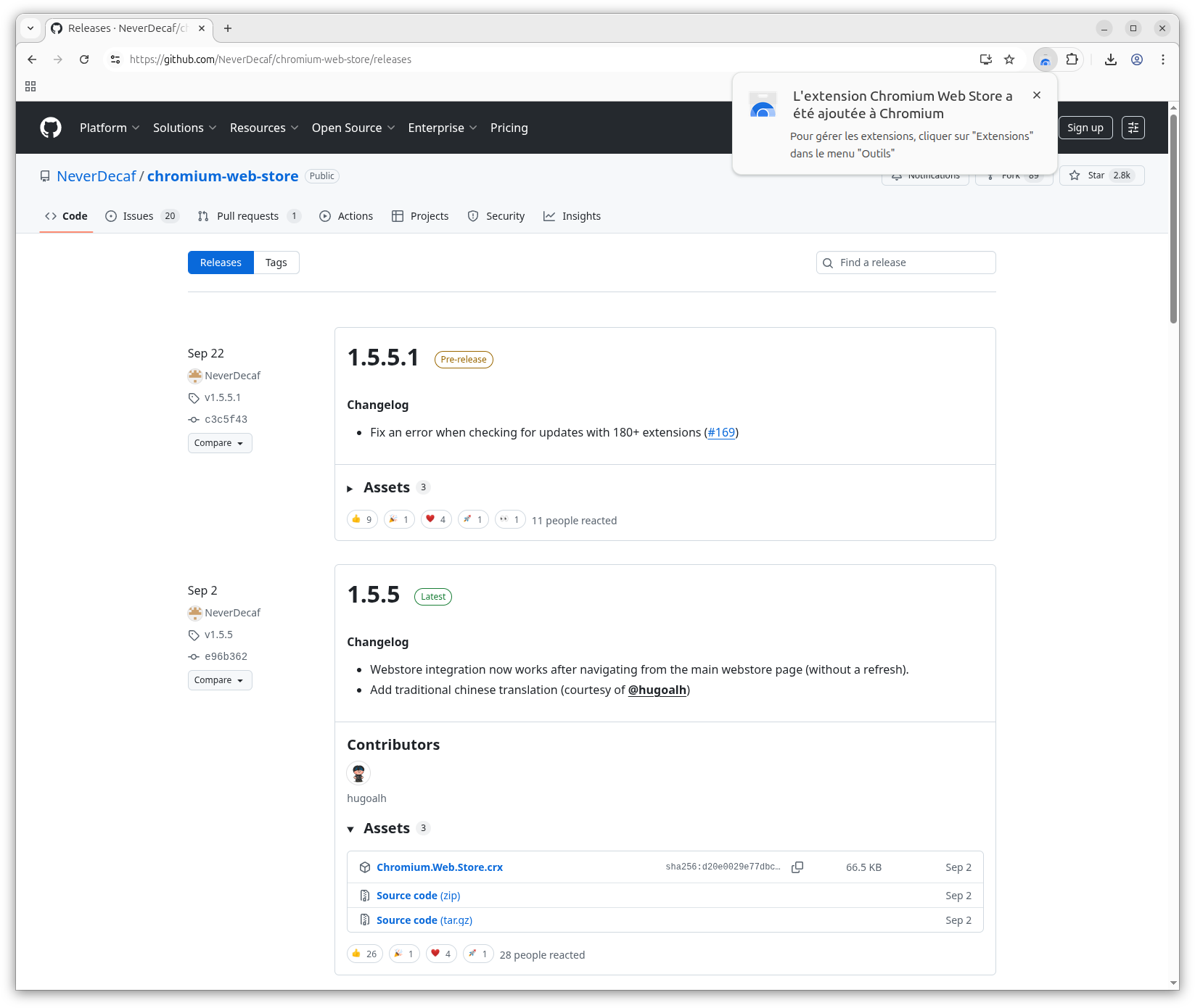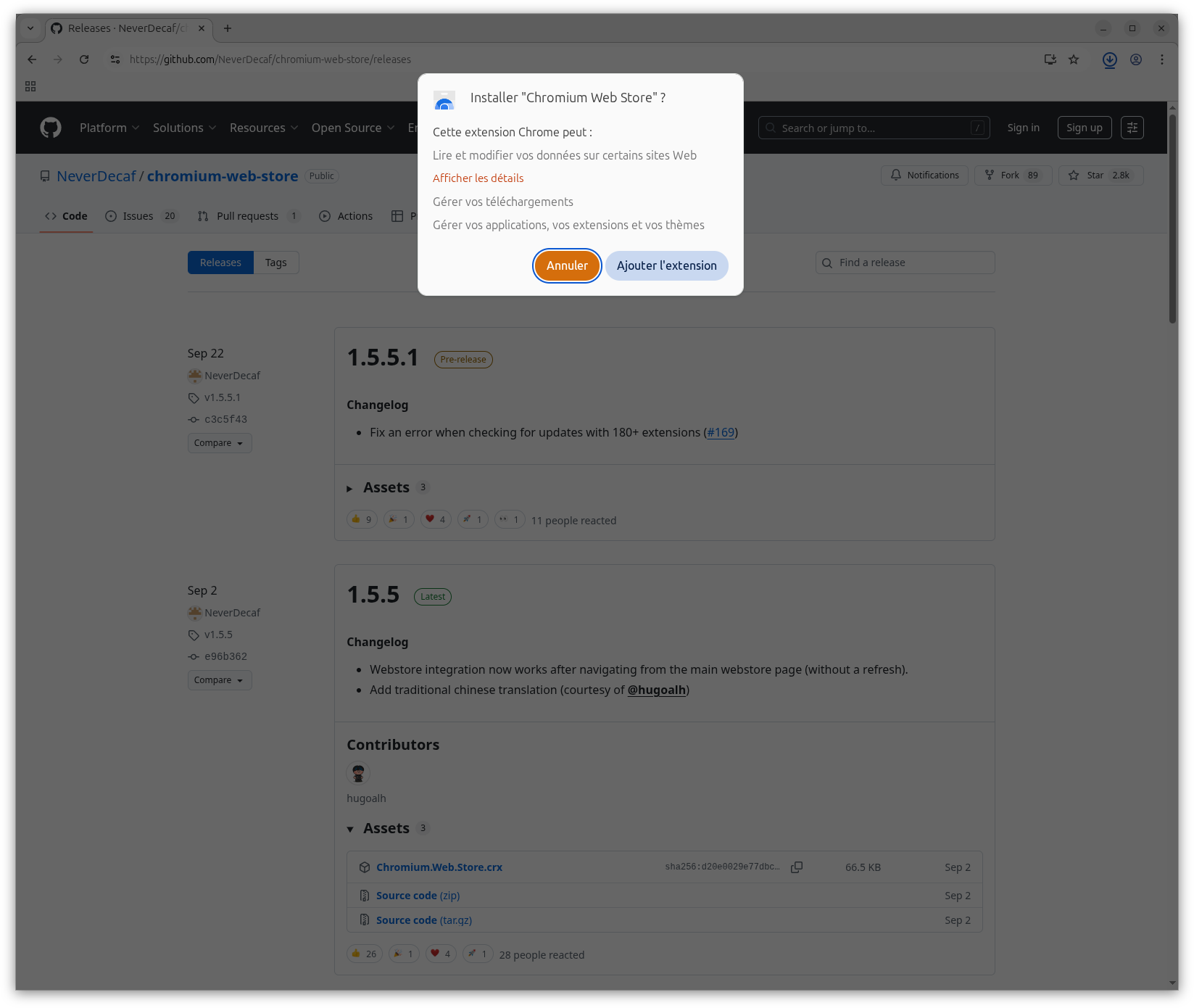 Attention de bien cliquer sur le lien du fichier avec extension .crx.- Vous obtenez une fenêtre "Installer Chromium Web Store ?". Cliquez sur Ajouter l'extension.