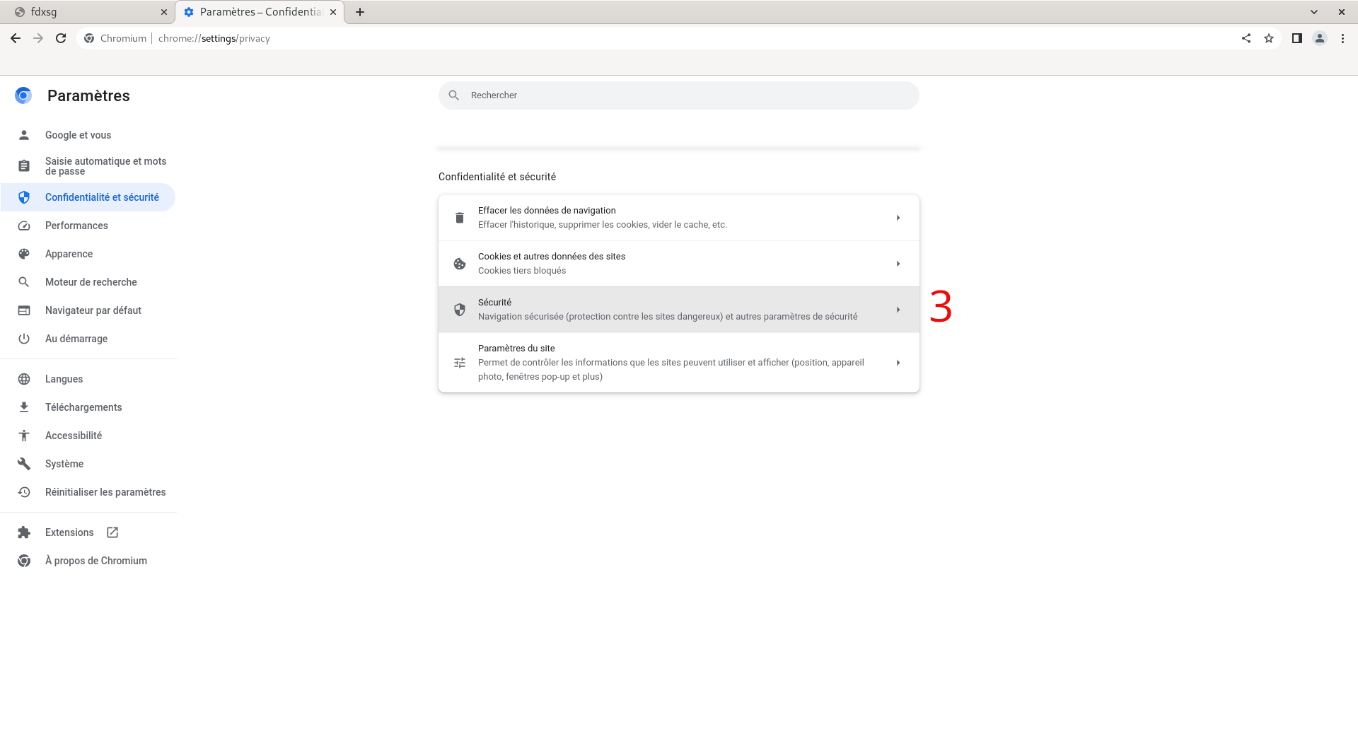 - Cliquez à gauche sur la partie "Confidentialité et sécurité"