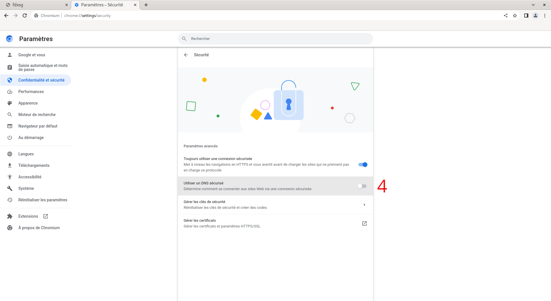 - Activer l'option Utiliser un DNS sécurisé (4) et choisissez dans le menu "Sélectionner un fournisseur DNS" le choix "Ajouter un fournisseur de services DNS personnalisé". Entrez dans le champ qui apparait l'adresse du serveur DNS choisi (ici par exemple DNS FDN : https://ns0.fdn.fr/dns-query).