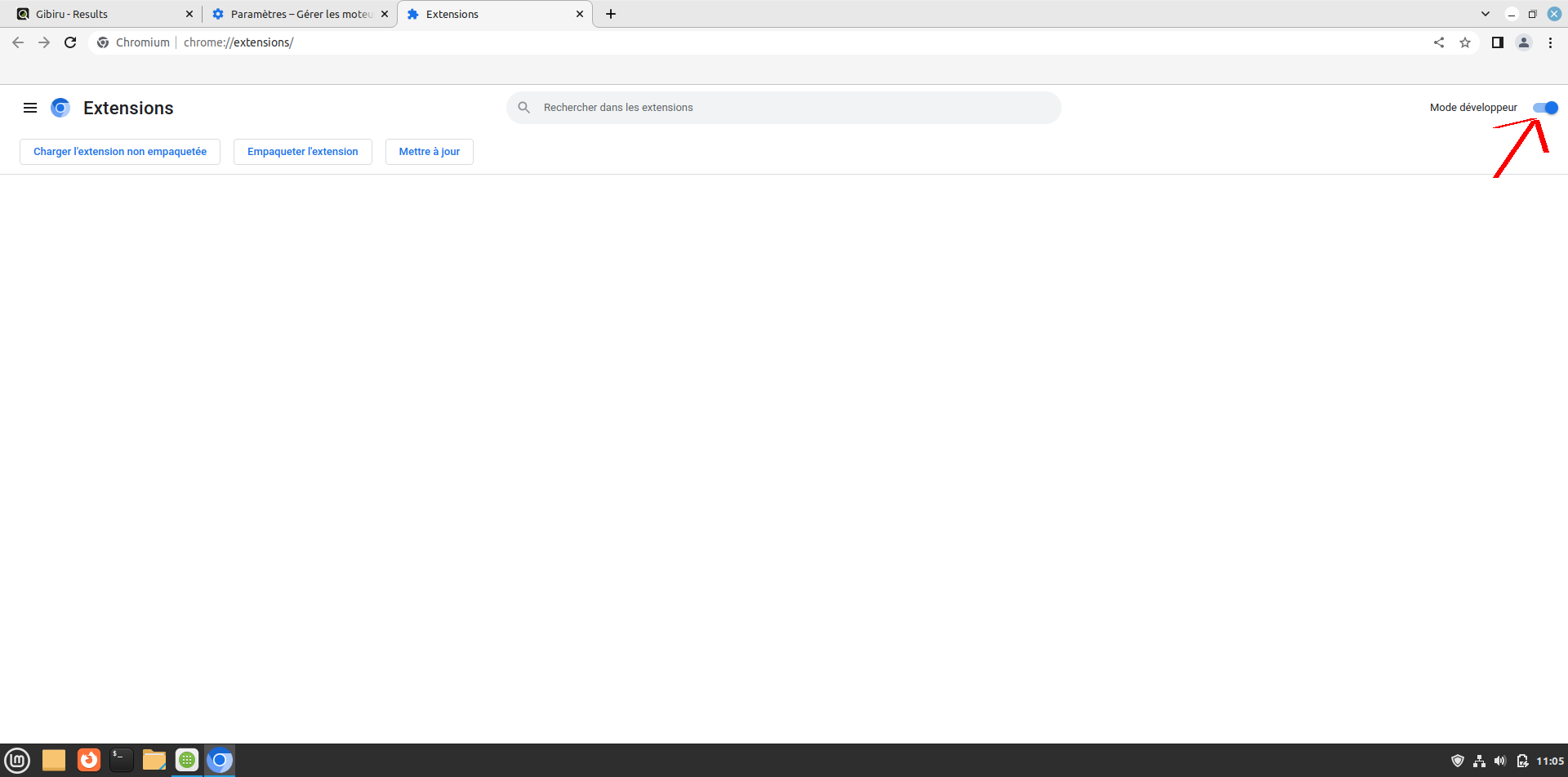 Nous allons ensuite activer le mode développeur pour pouvoir ajouter manuellement des extensions. Aller sur la page chrome://extensions/ puis procéder comme suit :