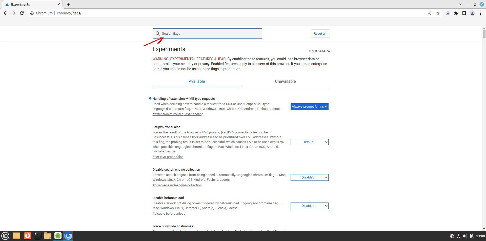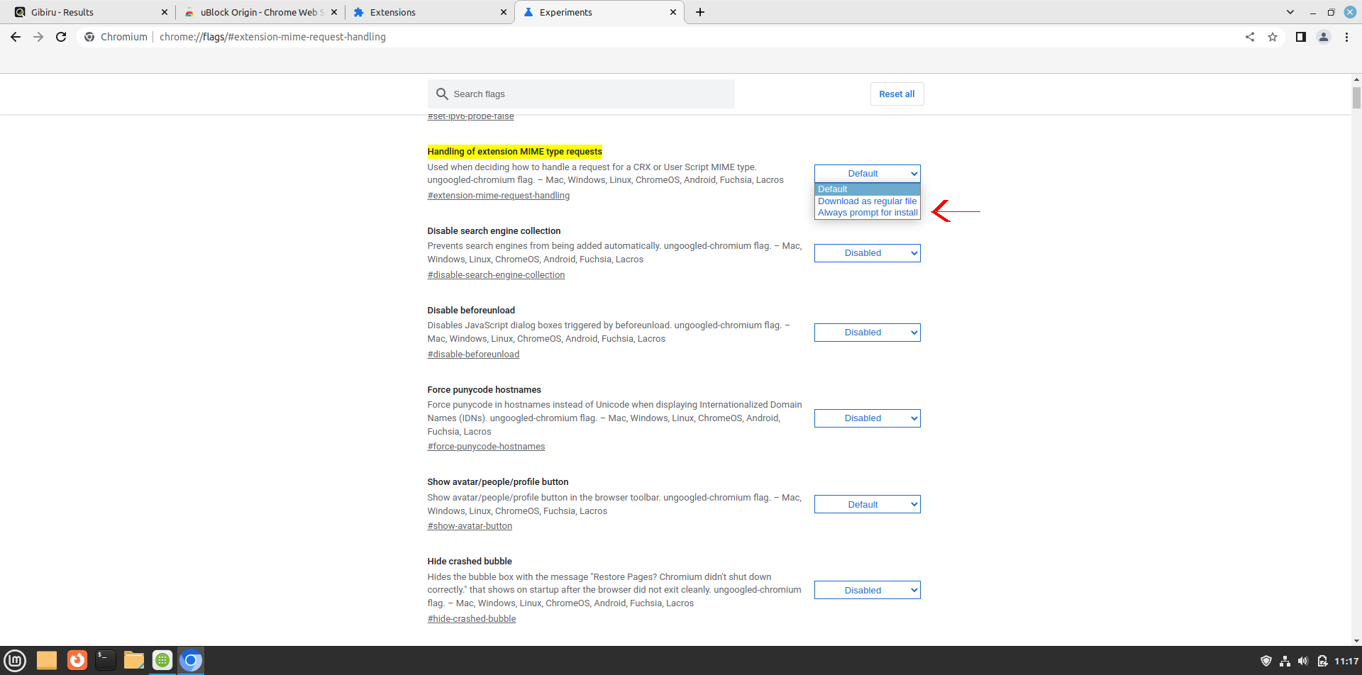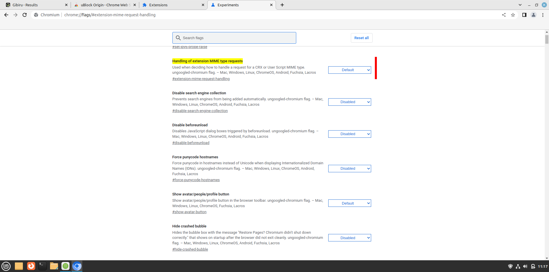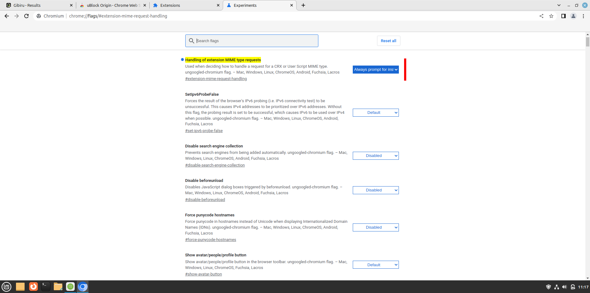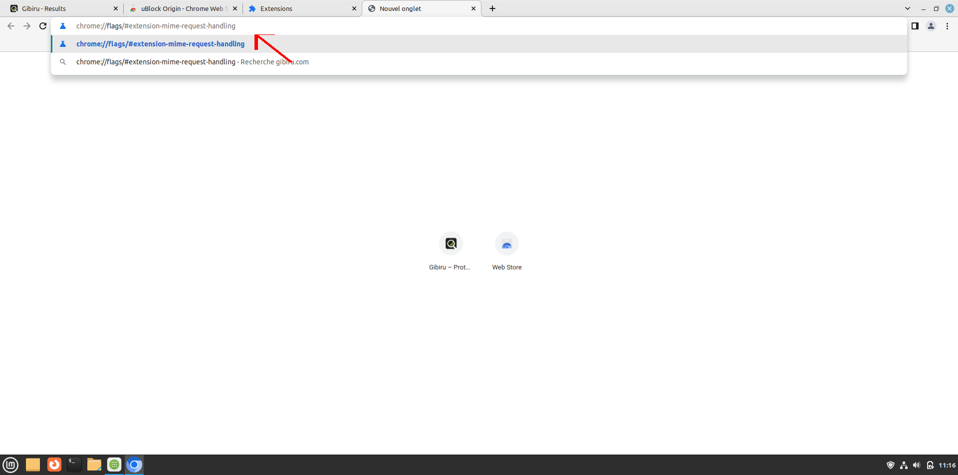 Nous allons configurer un premier paramètre important : taper dans la barre de recherche chrome://flags/#extension-mime-request-handling.