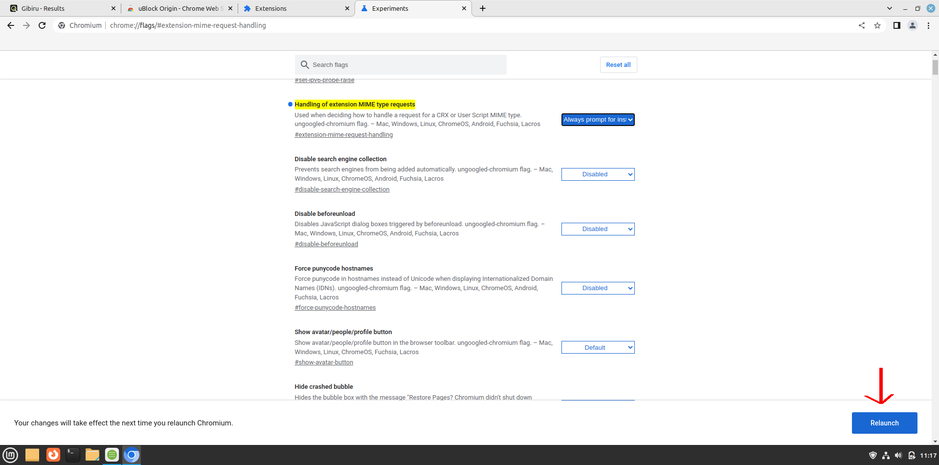 Sélectionner Always prompt for install et cliquer sur le bouton 'RELAUNCH' en bas à droite. Ceci aura pour conséquence de redémarrer le navigateur.