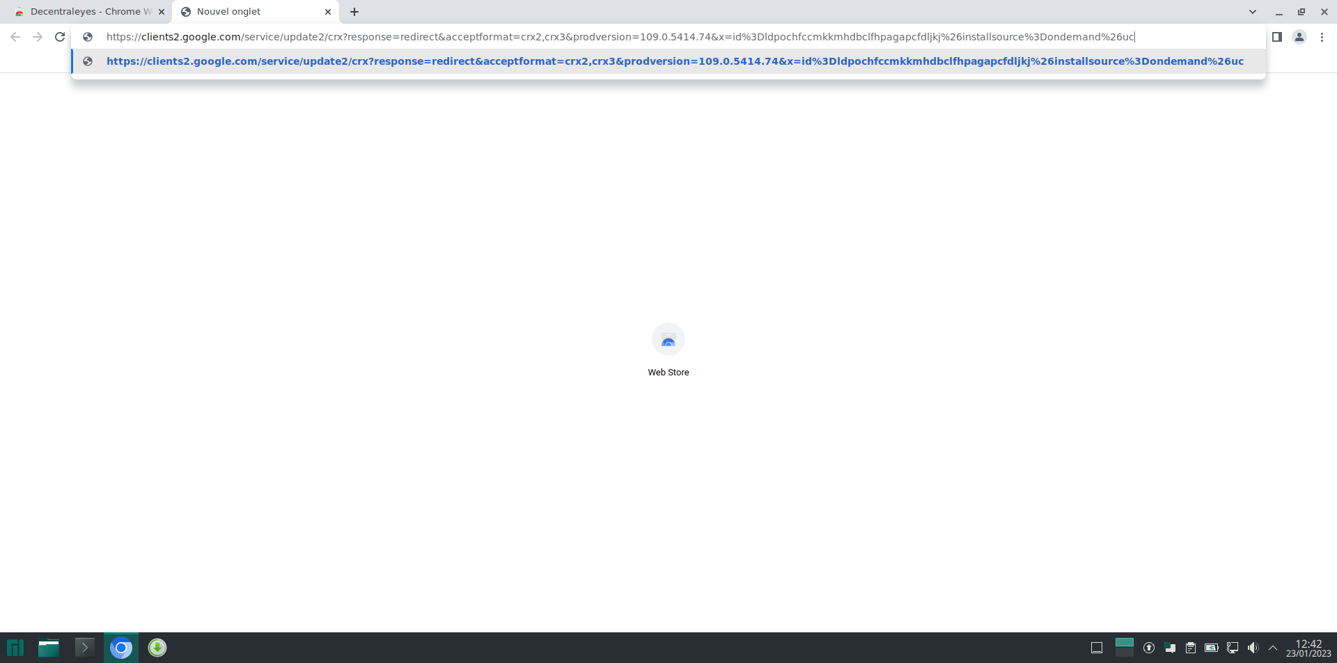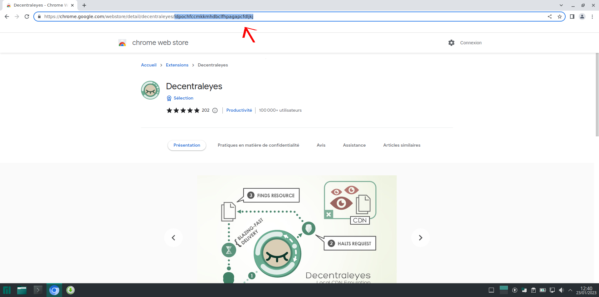 Allons ensuite chercher l'ID de l'extension Decentraleyes sur le Chrome Web Store :