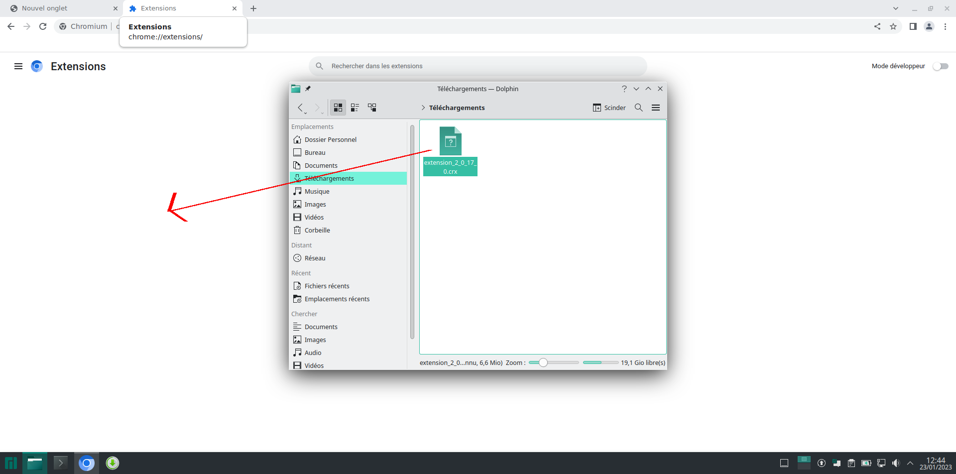 .crxd'ailleurs) s'est bien téléchargé. - Ouvrons notre gestionnaire de fichier à l'emplacement où se trouve ce fichier téléchargé (chez nous, il se trouve dans le répertoire