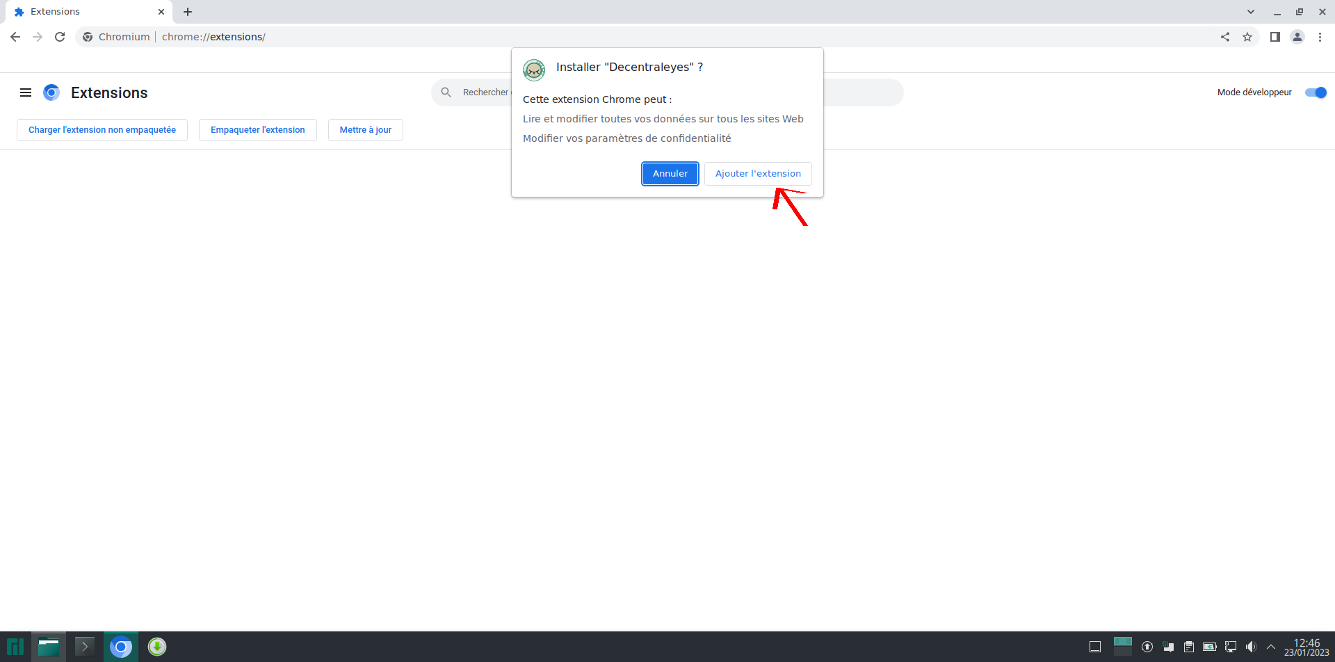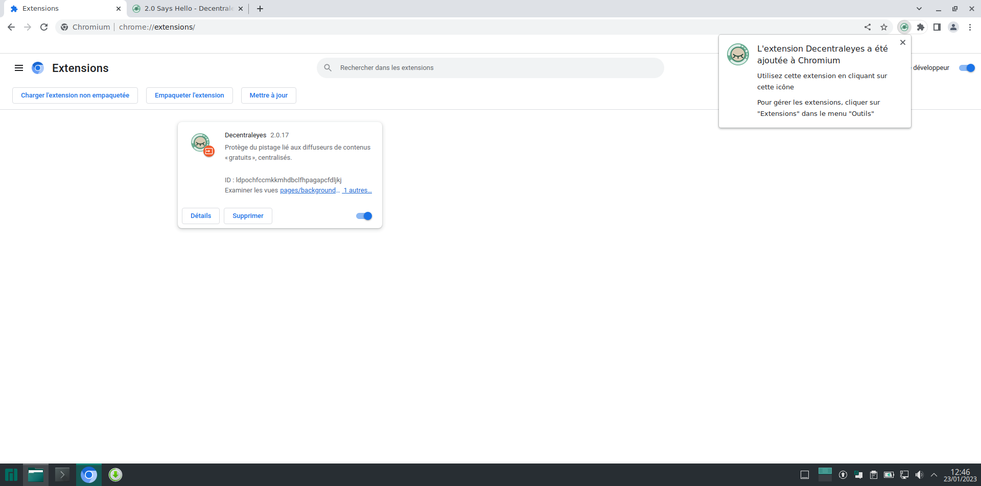 Un exemple : nous allons installer Decentraleyes suivant cette méthode sur une distribution test Manjaro. Notez que nous n'avons rien configuré de base, ni Extension-Mime ni CWS.