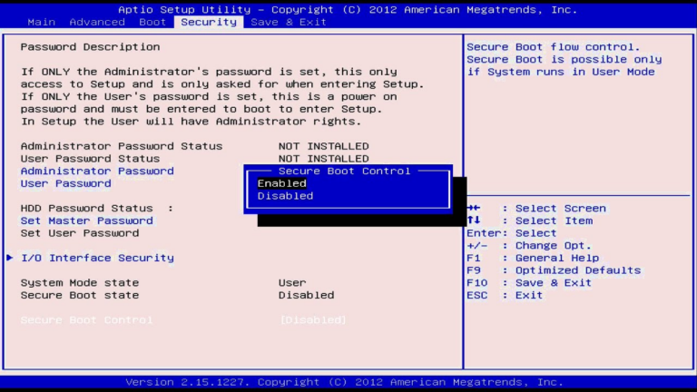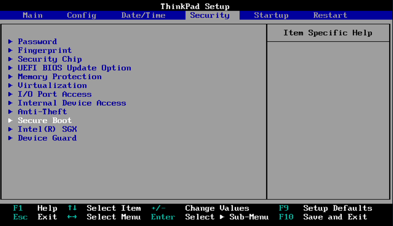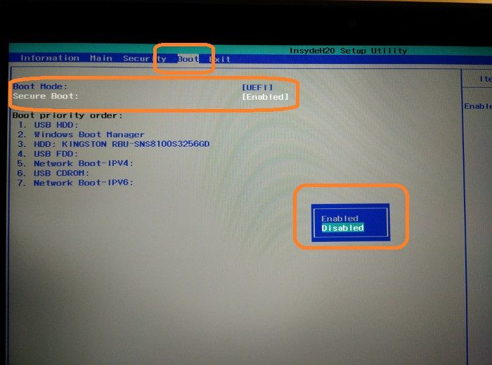 - Désactivez le Secure Boot en le passant à l'état "Disabled". Attention, il se peut que cette option ne soit pas visible dans ce menu. Dans ce cas, allez sur un menu comportant une mention "Security" ou s'en rapprochant, et cherchez une option avec "Secure Boot" pour le passer à l'état "Disabled".