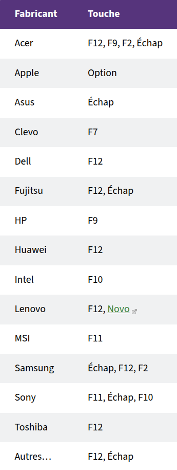 Essayez-les les unes après les autres, il est souvent impossible d'y arriver la première fois donc persévérez. Celle-ci dépend de la marque de votre machine et/ou de la carte mère, et il n'est pas trivial de la trouver.