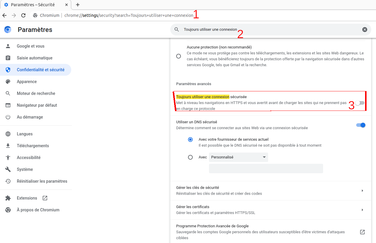 ▶️ Paramètres → Confidentialité et sécurité → Toujours utiliser des connexions sécurisées.