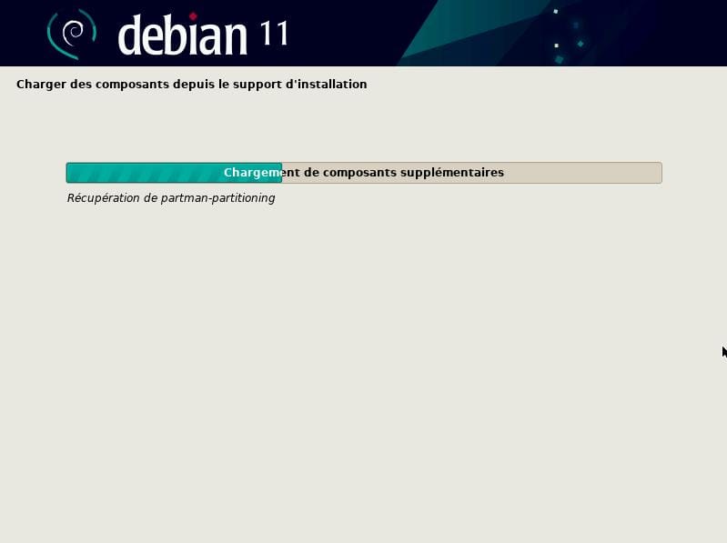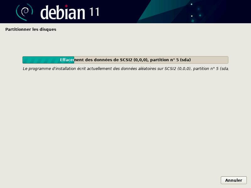 - Si vous avez choisi le chiffrement, Debian écrit des données aléatoires sur le disque :