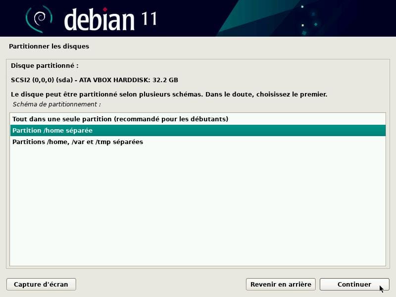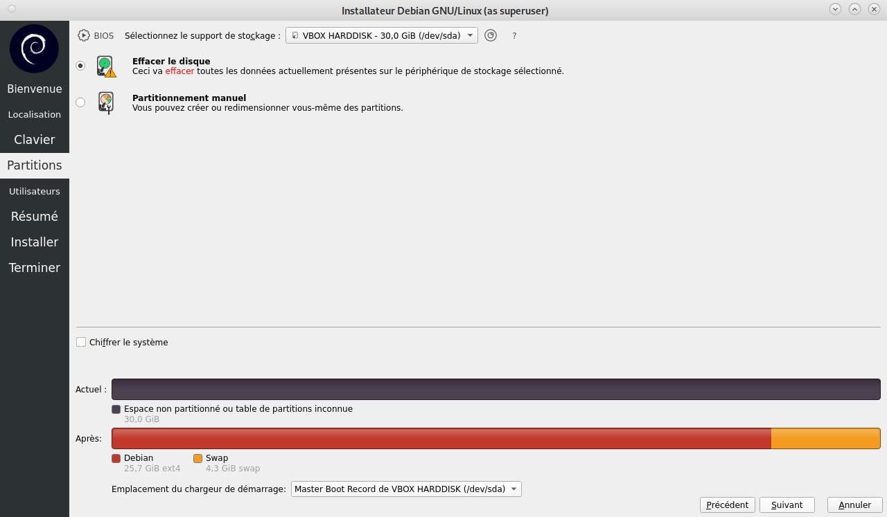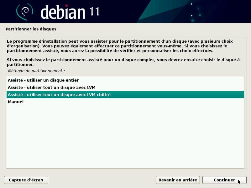 Nous recommandons "Assisté - utiliser un disque entier" avec partition/homeséparée. L'installateur créera automatiquement les partitions/boot, SWAP,/homeet/. L'intérêt de séparer/home: si ce dossier venait à être saturé, cela n'impacte pas le système.