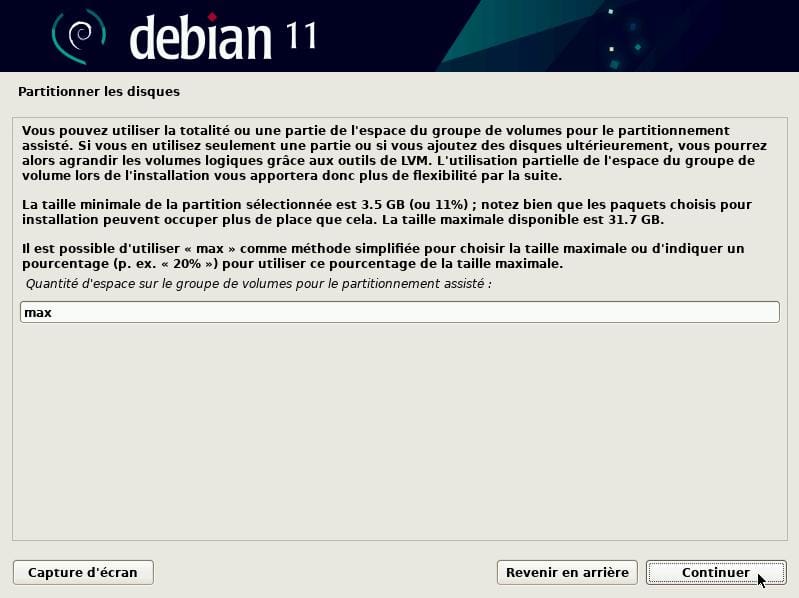 - Laissez la taille par défaut (l'installateur calcule le maximum automatiquement) :