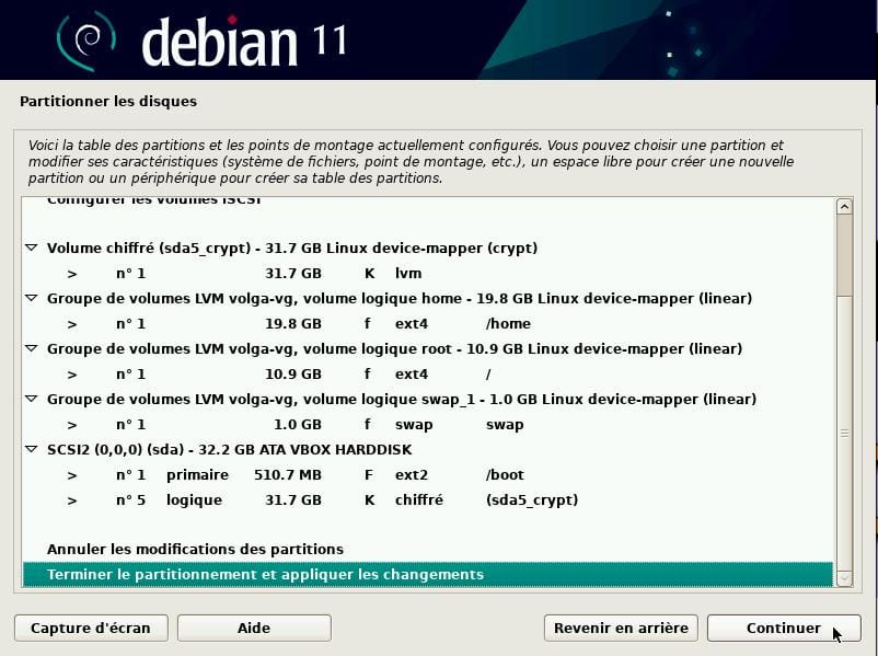 - Relisez le récapitulatif, sélectionnez "Terminer le partitionnement..." puis cliquez sur "Continuer" :
