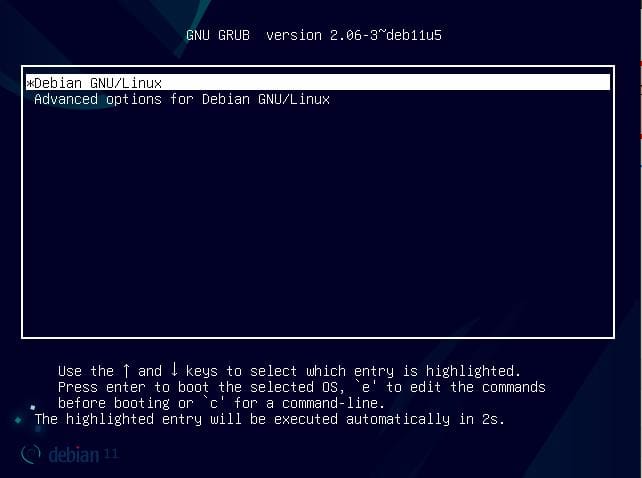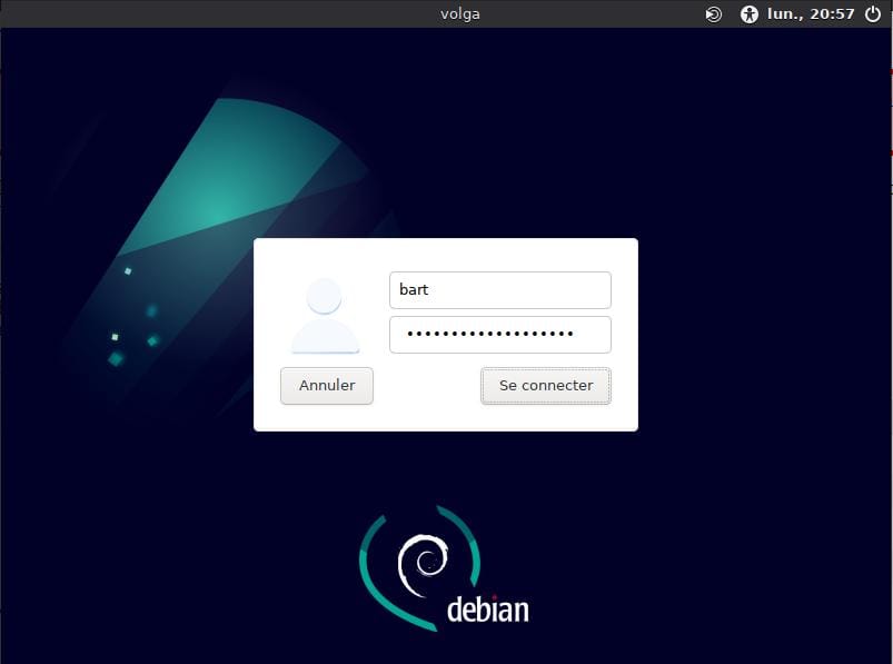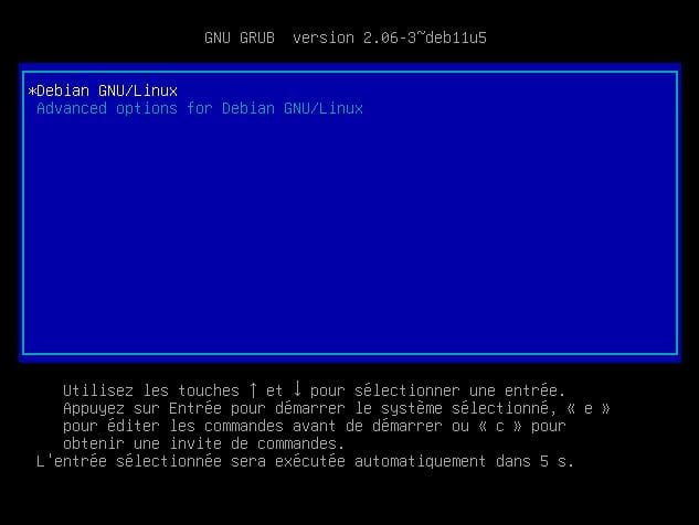 - L'écran de sélection du noyau apparaît brièvement, Debian démarre automatiquement.