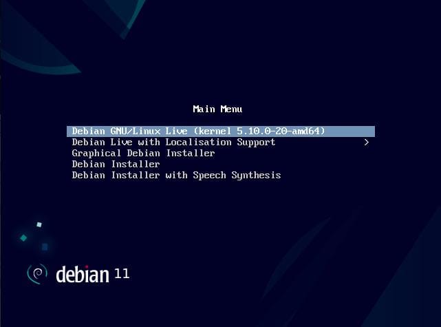 - Sélectionnez "Debian GNU/Linux Live ..." et appuyez sur Entrée.