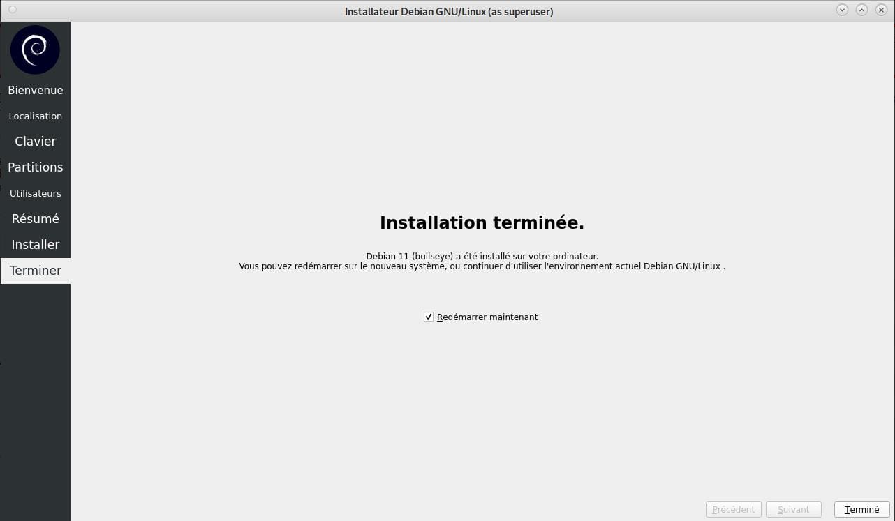 - Vérifiez que "Redémarrer maintenant" est coché puis cliquez sur "Terminé" :