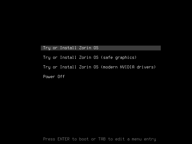 ▶️ Si vous avez une carte graphique NVIDIA plutôt récente sur votre machine, sélectionnez plutôt "Try or Install Zorin OS (modern NVIDIA drivers)"