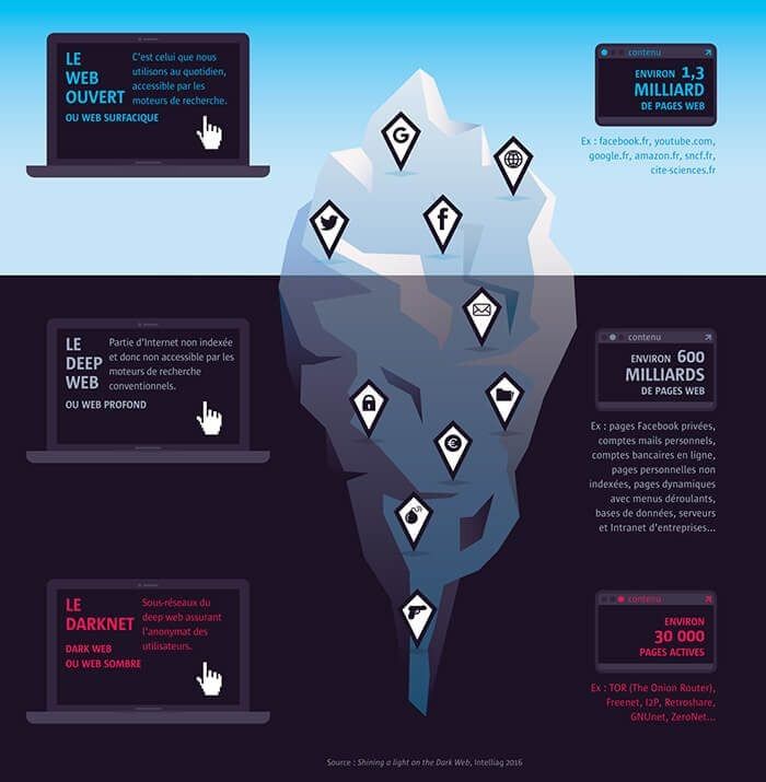 - Les Dark Webs (et leurs dark nets) : ils contiennent toute la part cachée d'internet (environ 5-6%), également bien entendu non indexée par des moteurs de recherche habituels ; il y a du bon et du moins bon. Le bon côté de ces darkwebs est le fait que certaines personnes puissent avoir la capacité de contourner les censures mises en place dans des pays autoritaires et donner un peu de liberté, et surtout d'anonymat. De l'autre côté, le plus sombre, certaines zones des darkwebs sont en effet liées à la criminalité, où l'on peut retrouver des sites marchands illégaux et autres choses peu reluisantes.
