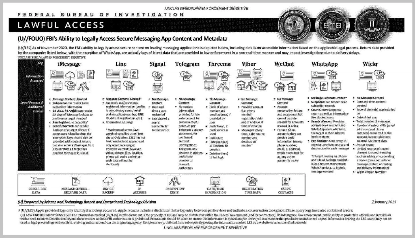 Il est également intéressant de voir que le FBI a créé un document qui liste les données qu'il peut extraire (légalement bien sûr 😉 !) de la plupart des messageries sur le marché :
