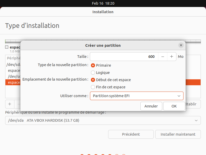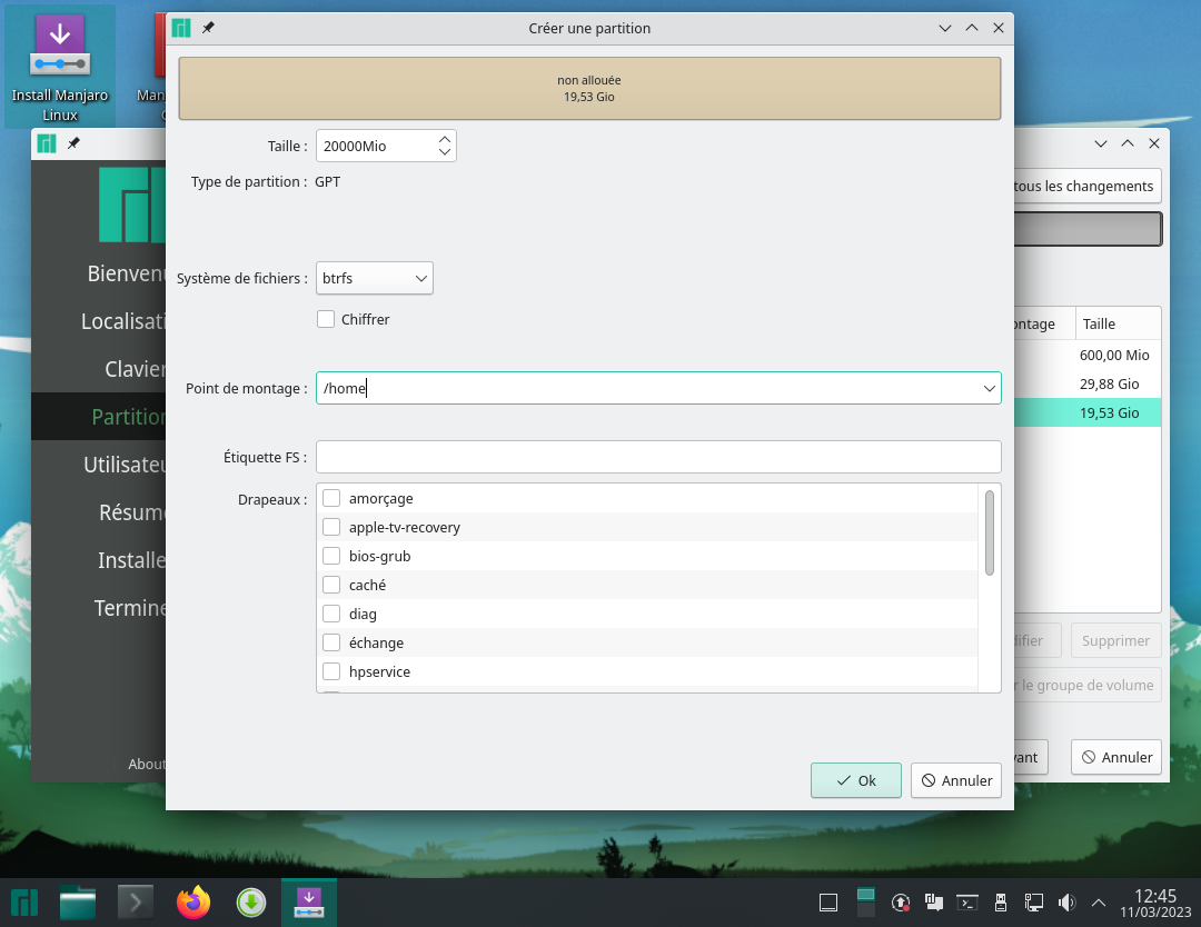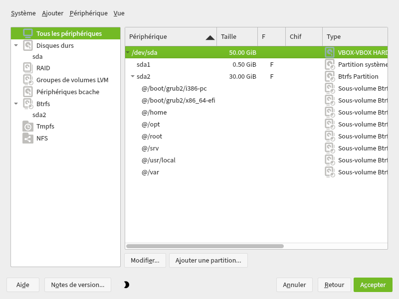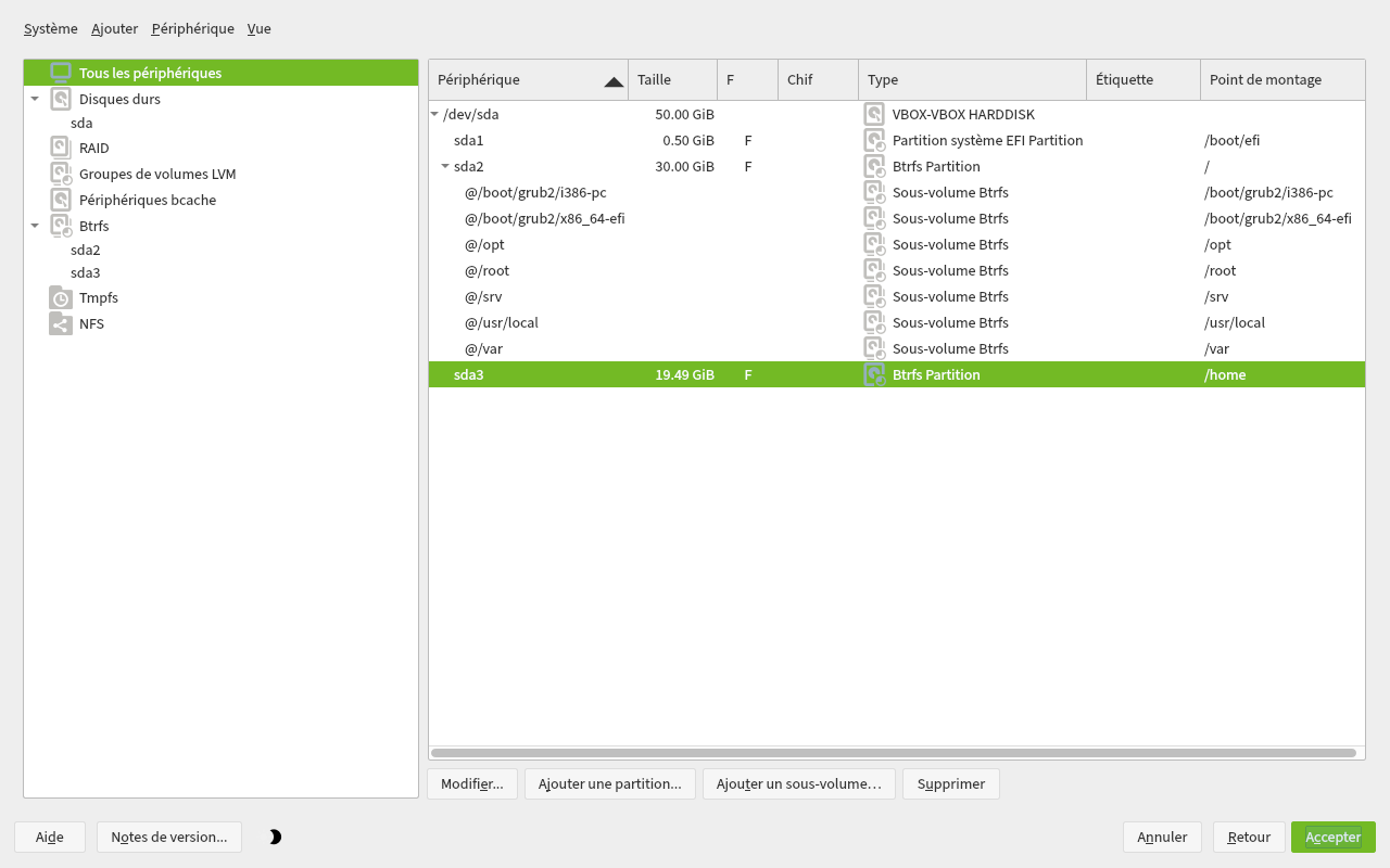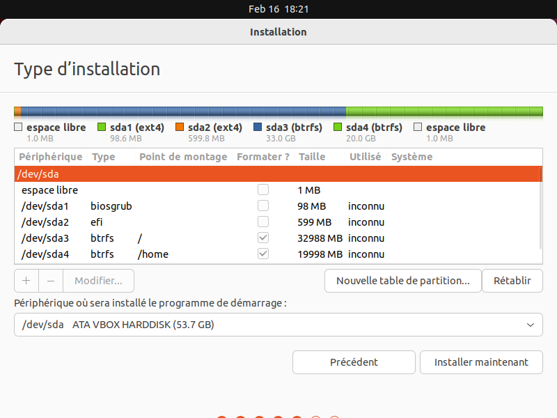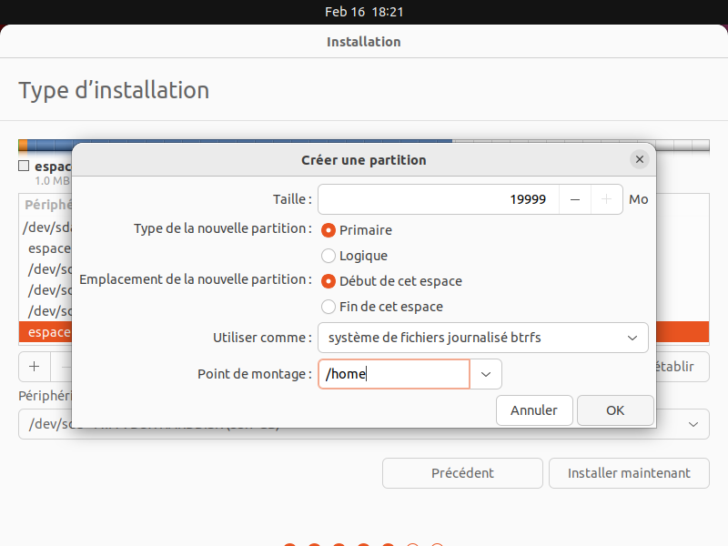 /homeserait plein. En effet, si une seule partition est présente, le système généralement renvoie toutes sortes d'erreurs qui amènent parfois à un blocage intégral du système. En séparant ces 2 partitions, nous pourrons mieux gérer cet aspect et éviter ce blocage. - Lorsque nous avons plusieurs distributions installées et que nous souhaitons partager cette partition entre les 2 systèmes ; c'est un cas assez rare, mais cette séparation rend moins complexe ce cas d'usage.