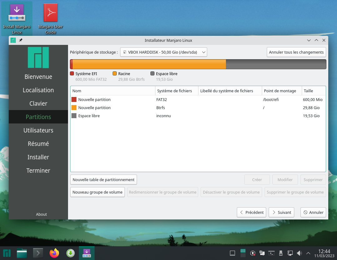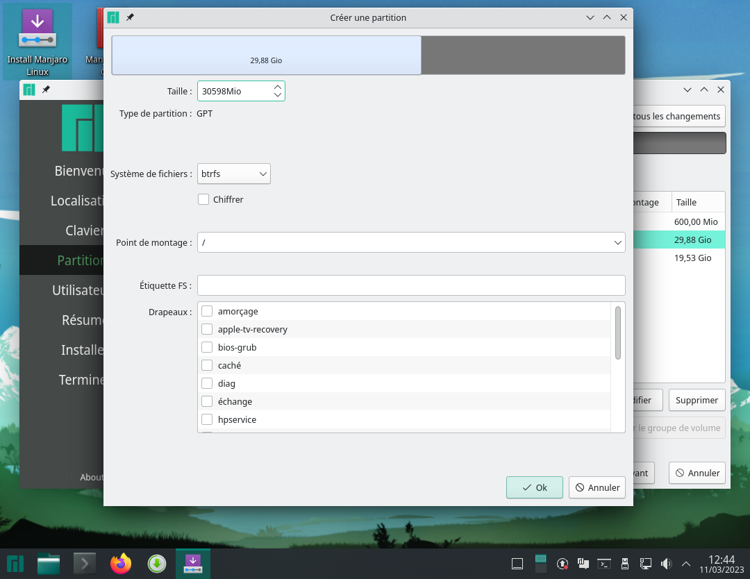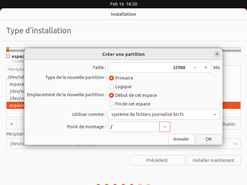 ➡️ Généralement, nous conseillons un rapport d'environ 1/3 pour la racine / et 2/3 pour votre /home, avec dans tous les cas un minimum de 30 à 40 Go pour la partition système /