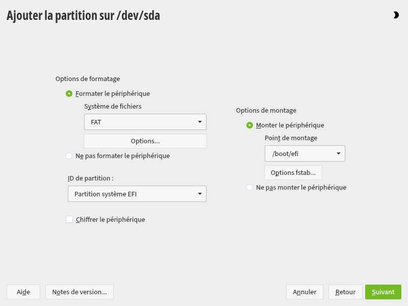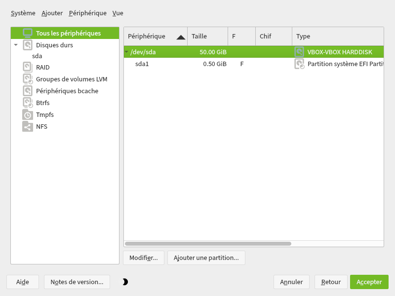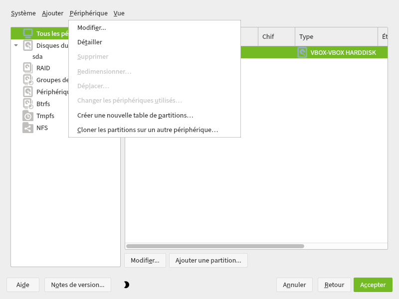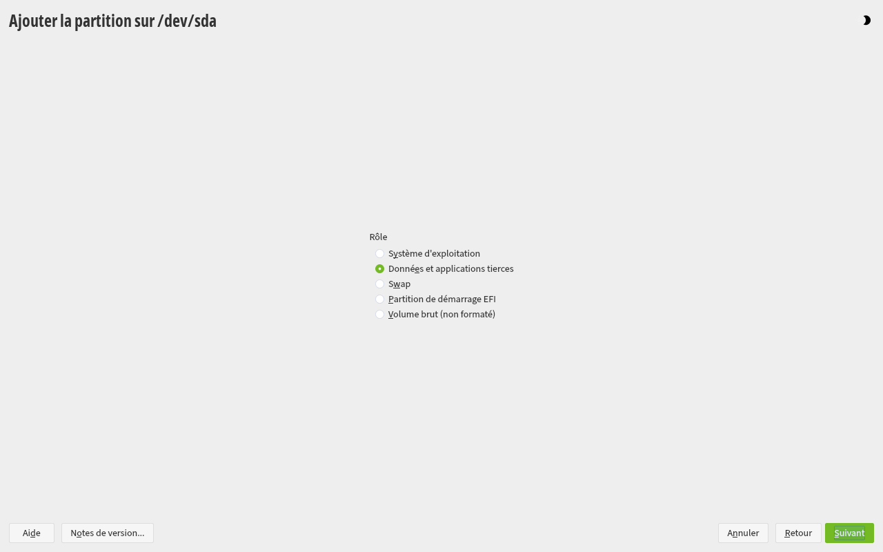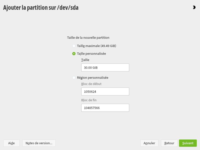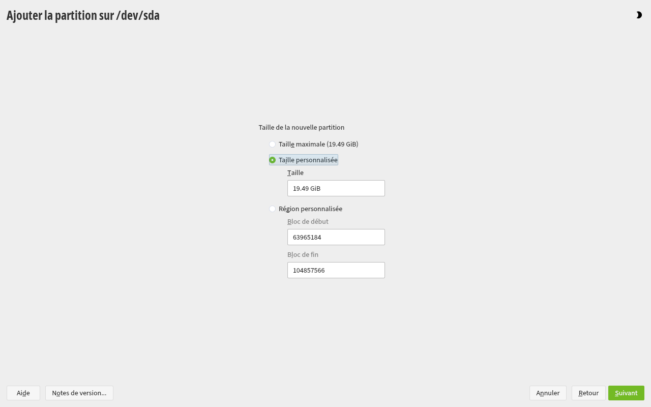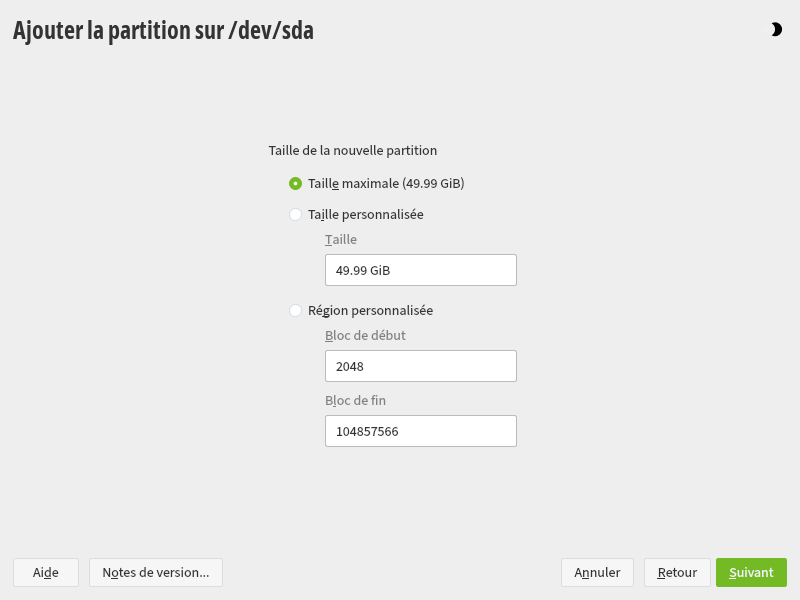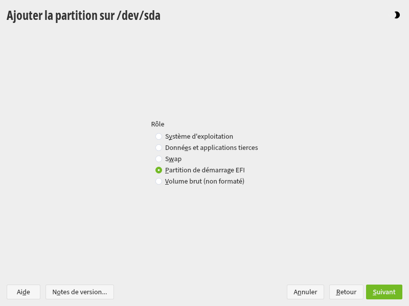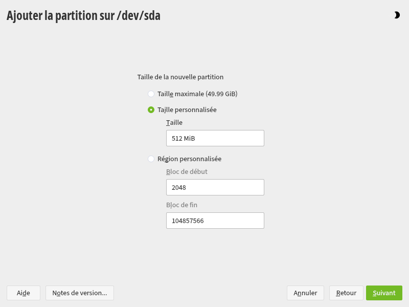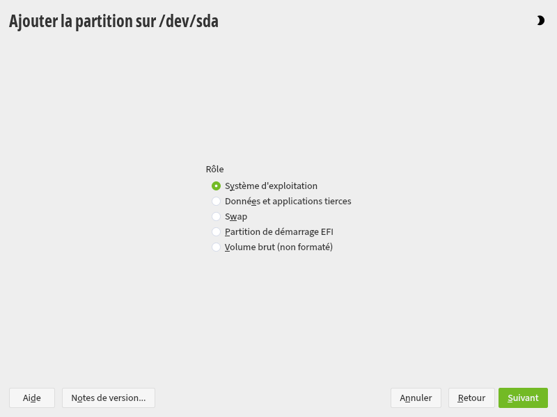 - Sélectionnez le disque (/dev/sda ou /dev/nvme0 ou ...), puis cliquez sur "Ajouter une partition..." :