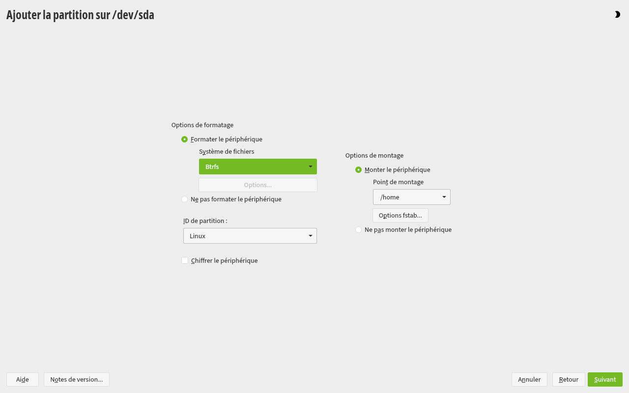 /home, faites attention à donner le même nom d'utilisateur et mot de passe que l'ancienne distribution. Ceci afin d'éviter des manipulations supplémentaires sur votre HOME (pour rappel : /home/<nom utilisateur>).- Cela permet aussi d'éviter un blocage système dans le cas où notre répertoire