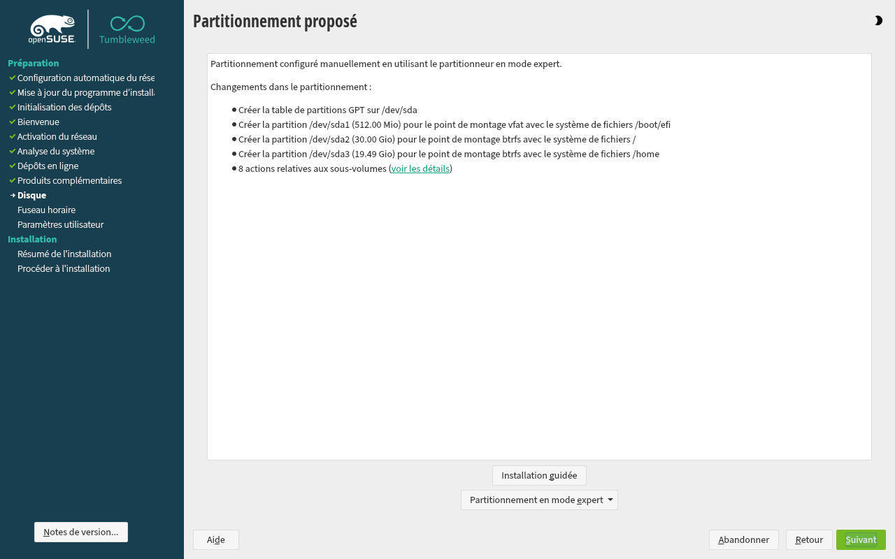 Les sections suivantes présentent une séparation avancée lors d'une nouvelle installation d'une distribution :