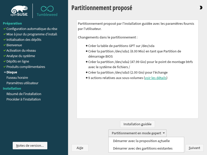 - Cliquez sur "Partitionnement en mode expert", et sélectionnez "Démarrer avec des partitions existantes" :
