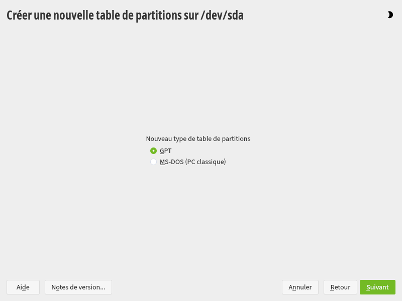 - Puis cliquez sur "Créer une nouvelle table de partitions..." :