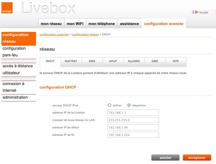 Dans l'interface d'administration de votre box, rendez-vous dans la section DHCP et désactivez-le. Sur une Livebox Orange, l'option se trouve dans "Réseau" > "DHCP".
