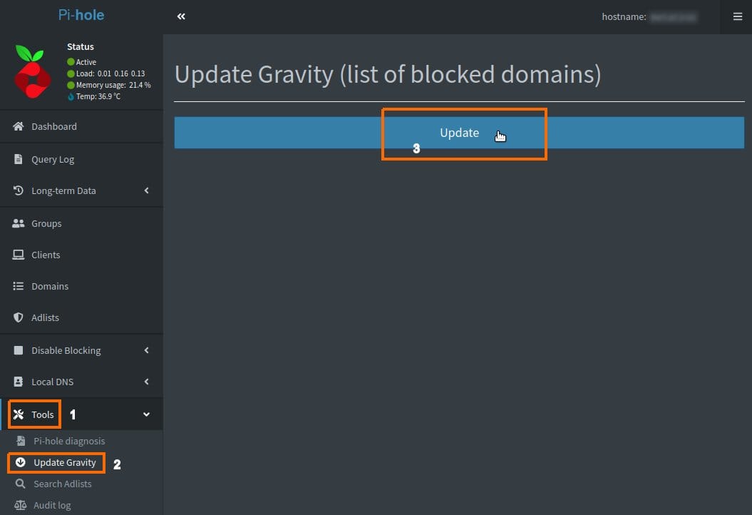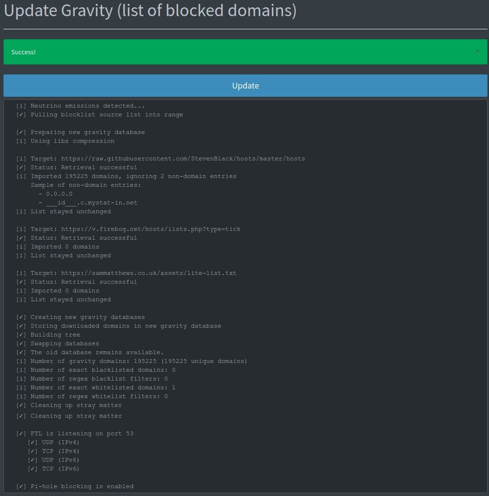 Le blocage repose sur des listes de domaines stockées dans la base de données Gravity de Pi-hole. Pour la mettre à jour manuellement :