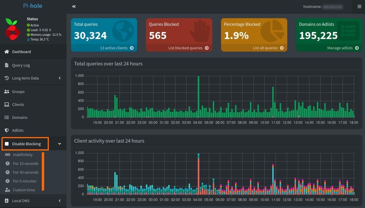 - Pour vérifier si Pi-hole est en cause, désactivez-le temporairement via le menu de gauche Disable Blocking : vous pouvez choisir 10 secondes, 30 secondes, 5 minutes, ou indéfiniment.