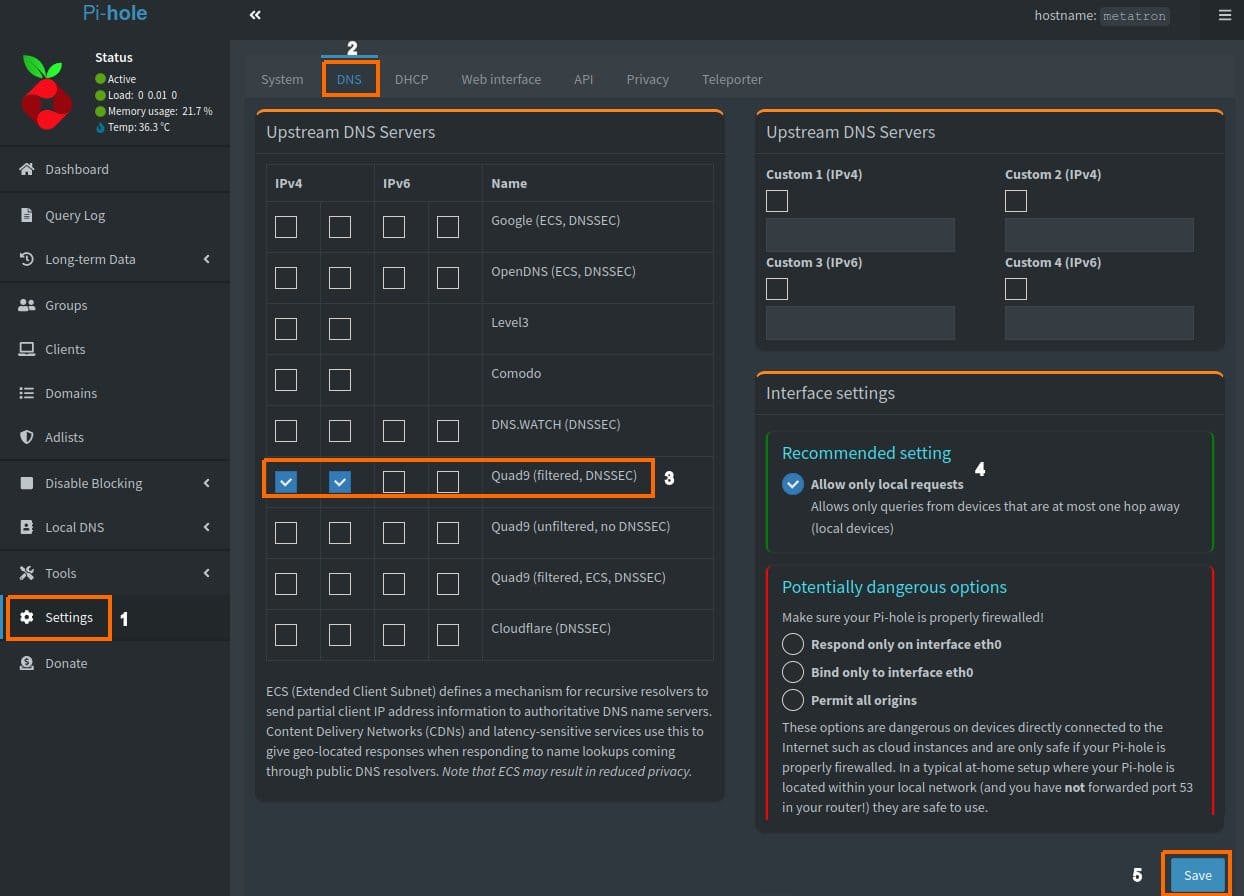Pi-hole a besoin d'un DNS "amont" pour résoudre les domaines qu'il ne bloque pas. Dans l'interface :