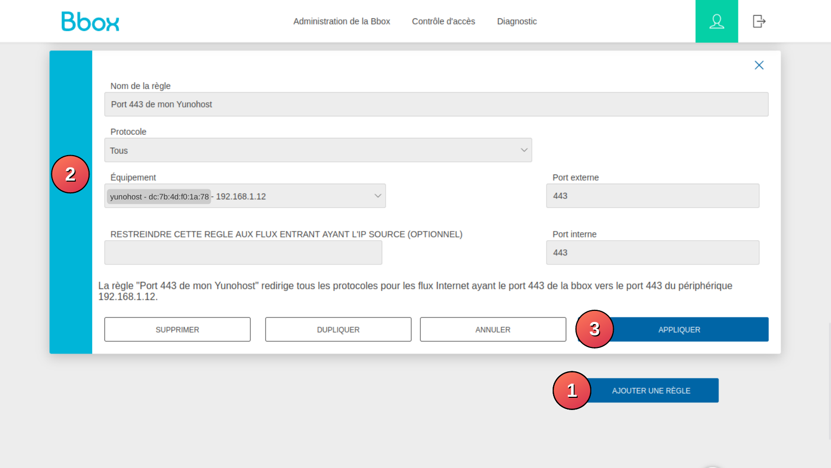 Le port 443 de votre box redirigera à présent toutes les requêtes vers le port 443 de votre ordinateur Yunohost. Vous avez donc à présent accès à votre installation Yunohost depuis Internet, sans avoir nécessairement besoin d'être connecté à votre Wifi.