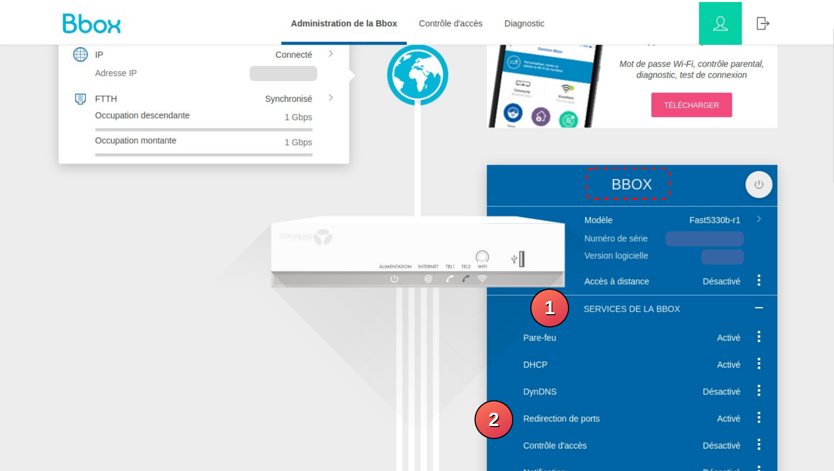 En arrivant sur la page de configuration de votre Box, allez dans la section BBOX. Puis déroulez le menu SERVICES DE LA BBOX. Enfin cliquez sur Redirection de ports.